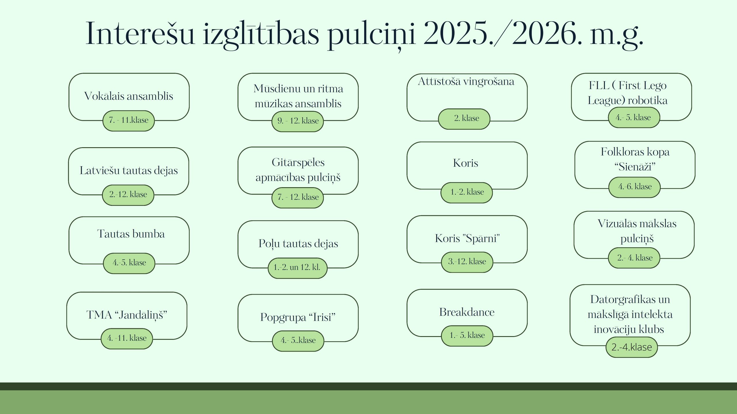- Iemācīt audzēkņiem vienkārša pavadījuma veidošanas paņēmienus dažāda stila dziesmām un dejām.