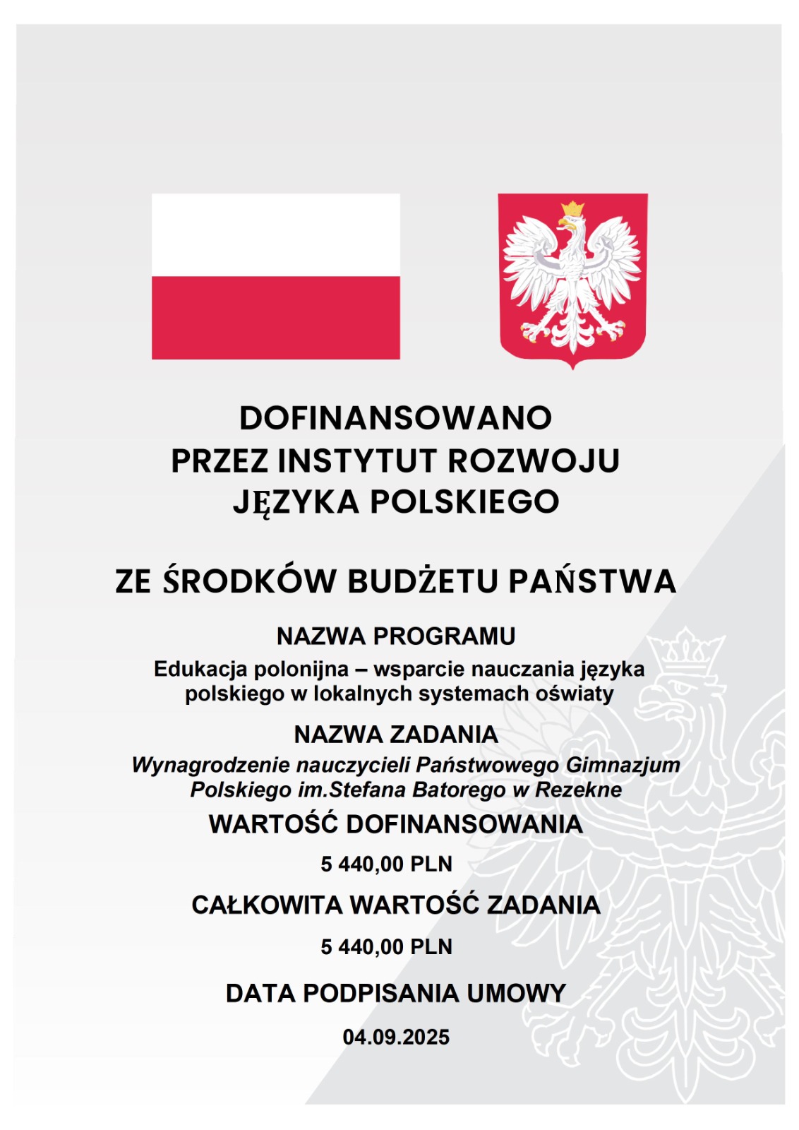„Dofinansowano przez Instytut Rozwoju Języka Polskiego im. świętego Maksymiliana Marii Kolbego ze środków budżetu państwa przekazanych przez Fundację “Pomoc Polakom na Wschodzie im. Jana Olszewskiego”